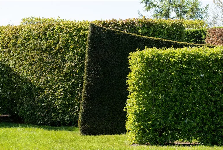 Der Buchsbaum ist eine klassische Heckenpflanze, die ebenfalls eher langsam wächst, dafür aber als recht langlebig und schnittverträglich gilt. Durch seine Anfälligkeit gegenüber Pilzerkrankungen hat er ein wenig an Attraktivität eingebüßt, zählt aber nach wie vor zu den beliebtesten Hecken als Sichtschutz. Es gibt Buchsbaumsorten, die sich eher als niedrige Hecken eignen und ebenso Sorten, die zu höheren Hecken heranwachsen können. Allerdings ist hier Geduld gefragt, denn der Buchsbaum wächst pro Jahr nur etwa 20 Zentimeter. Er ist recht pflegeleicht und wenig anspruchsvoll. Deshalb ist er sowohl im Schatten als auch an sonnigen Standorten zufrieden. Im Sommer sollte er täglich gewässert werden, denn er bevorzugt feuchte und kalkhaltige Böden. Ideal ist eine zusätzliche Mulchschicht, die das Austrocknen des Bodens verhindert.