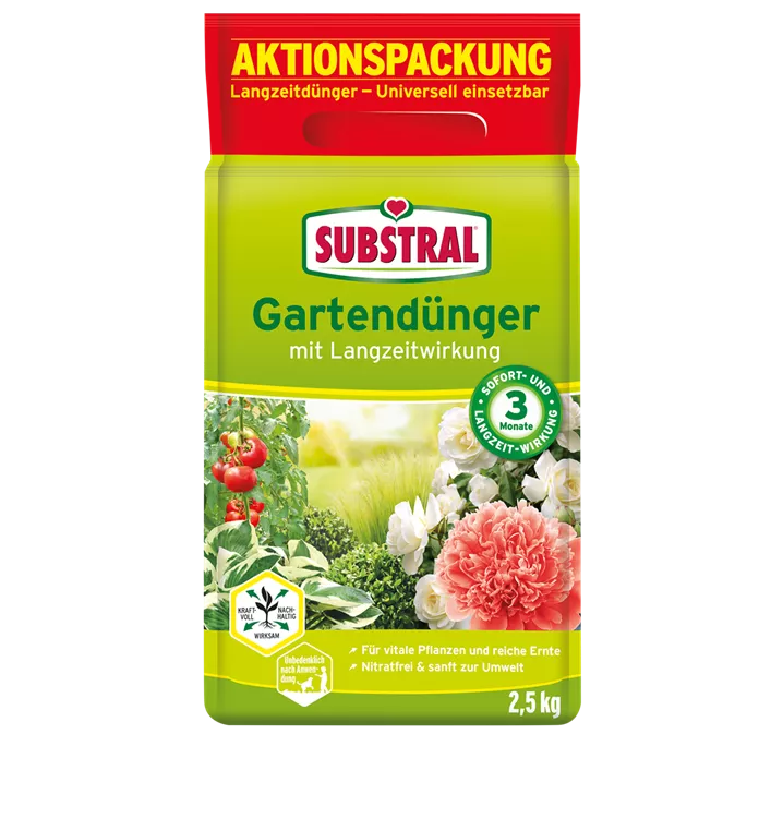 SUBSTRAL Gartendünger mit Langzeitwirkung enthält 25% des Stickstoffs in Form von Langzeitstickstoff. Als Speicherstickstoff wird dieser sukzessive über 3 Monate freigesetzt. Dadurch wird zum einen das Risiko von Auswaschungsverlusten minimiert. Zum anderen wird gewährleistet, dass die Pflanzen ihn optimal nutzen können.