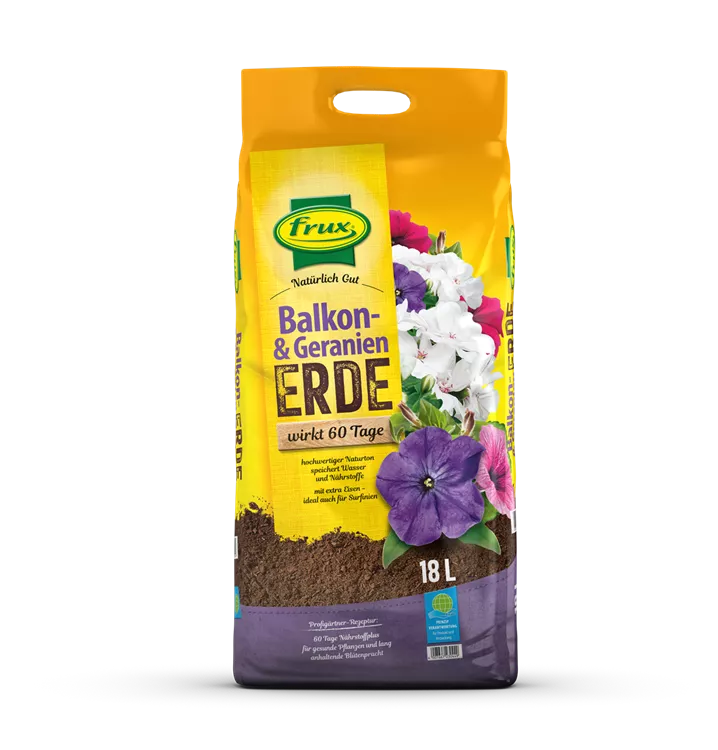 Die frux Balkonblumen- & Geranienerde – mit extra Eisen ist ein gebrauchsfertiges Kultursubstrat, das genau auf die Bedürfnisse Ihrer Geranien, Petunien und anderer Balkonpflanzen abgestimmt ist. Durch den hohen Anteil an Naturton und die ausschließliche Verwendung von hochwertigem Torf mit optimaler Struktur garantiert diese Erde eine sehr gute Wasser- und Nährstoffspeicherung. Die Erde bleibt vergießfest, atmungsaktiv und gibt durch den hohen Tonanteil Wachstums- und Blühsicherheit auch während länger dauernder Hitze- und Nässeperioden. Sie enthält Vorratsdünger und alle für das Pflanzenwachstum notwendigen Nährstoffe sowie extra Eisendünger, ideal für Petunien und andere eisenbedürftige Pflanzen. Eine Nachdüngung der Pflanzen ist daher erst nach ca. 4 bis 6 Wochen notwendig.