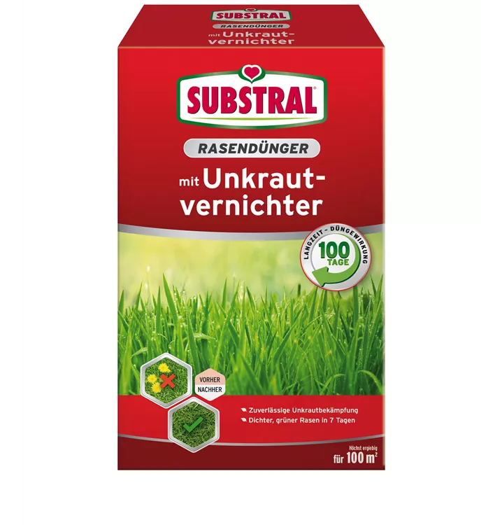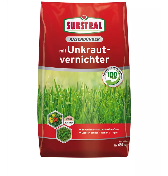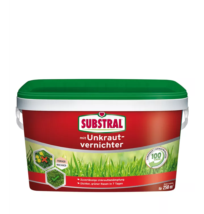 Substral Rasendünger mit Unkrautvernichter ist bei gleichzeitig hochwertiger Rasendüngung ein zuverlässiger Unkrautbekämpfer in einem Arbeitsgang. Er befreit von Unkraut und sorgt für einen dichten, saftig grünen Rasen.