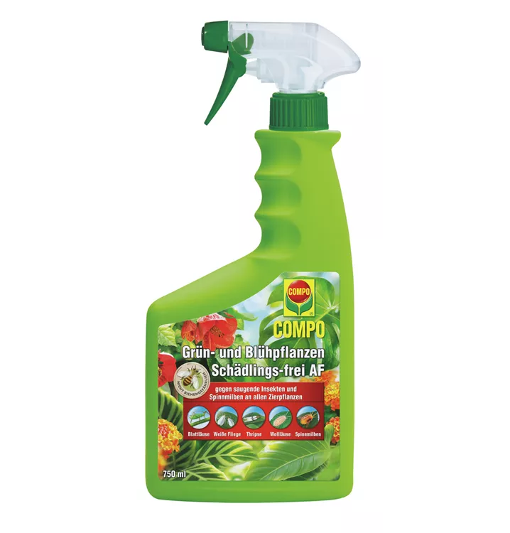 COMPO Grün- und Blühpflanzen Schädlings-frei AF ist ein anwendungsfertiges Kontaktinsektizid und-akarizid, das wirkungsvoll eine Vielzahl von saugenden Insekten wie z.B. Blattläuse, Weiße Fliege, Thripse, Zikaden, Schild- und Wollläuse sowie Spinnmilben bekämpft. Angewendet werden kann das COMPO Grün- und Blühpflanzen Schädlings-frei AF an Zierpflanzen (Grün- und Blühpflanzen) im Garten, in Wohnräumen, auf Balkonen und Terrassen oder auch im Gewächshaus. Der bewährte Wirkstoff basiert auf natürlichem Rapsöl und ist nicht bienengefährlich.