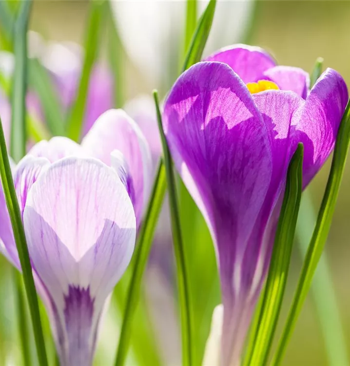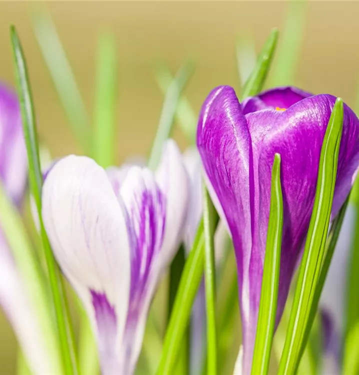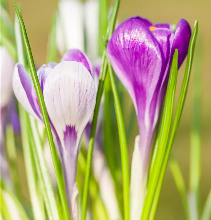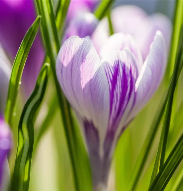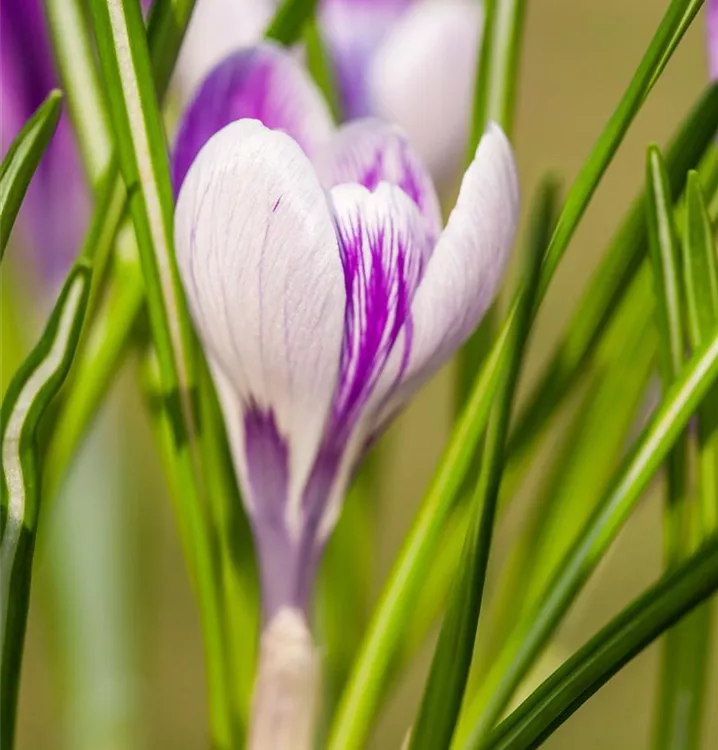 Der großblumige Frühlings-Krokus (Crocus vernus) ‘King of the Striped’, leuchtet wundervoll mit seinen weiß-lila-farbenen Blüten. Der Krokus ‘King of the Striped’ zeigt sich jedes Frühjahr von seiner schönsten Seite. Die inneren und äußeren Blütenblätter tragen eine sehr deutliche Streifenzeichnung. Hummeln und Bienen fliegen auf ihn.