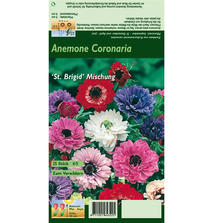 Welch eine Pracht, wenn die Anemone 'St Brigid' ab Mai ihre herrlichen, weißen, rosafarbenen, roten, lilafarbenen bis blauen Blüten hervorbringt! Das Besondere: sie sind gefüllt. Über den mittelgrünen, tief geschlitzten Blättern kommen die Blüten besonders gut zur Geltung. Wird Anemone coronaria 'St Brigid' an einen sonnigen bis halbschattigen Standort mit durchlässigem und humosem Boden gepflanzt, entwickelt sie sich besonders gut. Sie wächst aufrecht, rhizombildend und erreicht Größen von 20 cm bis 30 cm bei einer Breite von 5 cm bis 8 cm. Anemone coronaria 'St Brigid' hat sich als besonders pflegeleicht erwiesen.