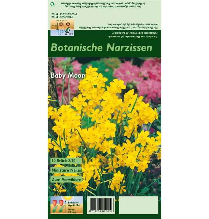 Welch eine Pracht, wenn die Narzisse 'Baby Moon' ab April ihre herrlichen, goldgelben, radförmigen oder röhrenförmigen Blüten hervorbringt! Das Besondere: sie verbreiten einen angenehmen Duft. Über den dunkelgrünen, linealen Blättern kommen die Blüten besonders gut zur Geltung. Wird Narcissus jonquilla 'Baby Moon' an einen sonnigen Standort mit durchlässigem, lockerem und nährstoffreichem Boden gepflanzt, entwickelt sie sich besonders gut. Sie wächst aufrecht und erreicht Größen von 15 cm bis 20 cm bei einer Breite von 8 cm bis 10 cm. Sehr dekorativ macht sich die Narzisse 'Baby Moon' auch in Kübeln oder Kästen.
