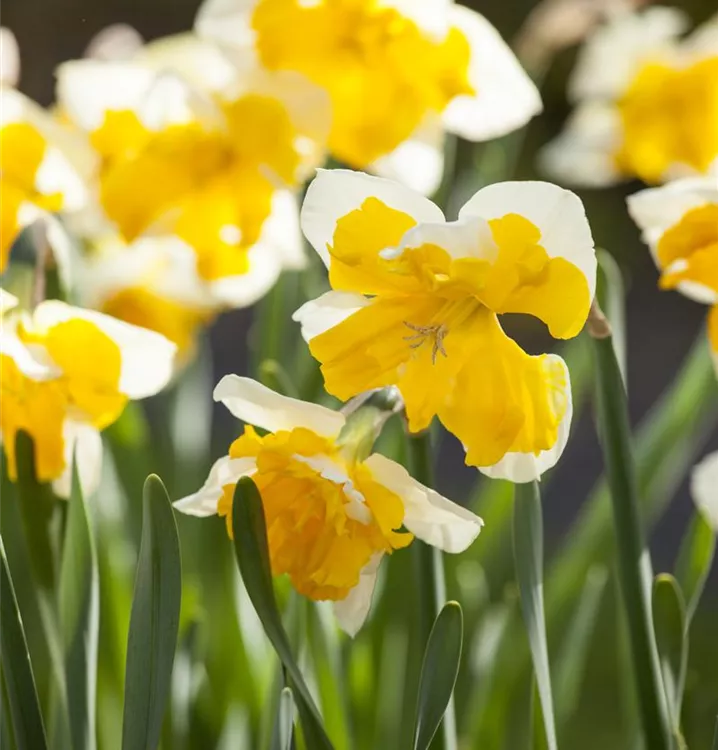 Welch eine Augenweide, die Blüten der Schmetterlings-Narzisse 'Orangery'. Einfach herrlich wie diese weiß-gelbfarbenen, radförmigen Blüten strahlen! Un d dazu verbreiten sie auch noch einen angenehmen Duft. Über den dunkelgrünen lilienförmigen Blättern kommen die Blüten besonders gut zur Wirkung. Wird die Narcissus 'Orangery' an einen sonnigen Standort mit durchlässigem, lockerem und nährstoffreichem Boden gepflanzt, entwickelt sie sich besonders gut. Sie wächst aufrecht und erreicht Größen von 30 cm bis 40 cm bei einer Breite von 10 cm bis 15 cm. Sehr dekorativ macht sich die Schmetterlings-Narzisse 'Orangery' auch in Kübeln oder Kästen.