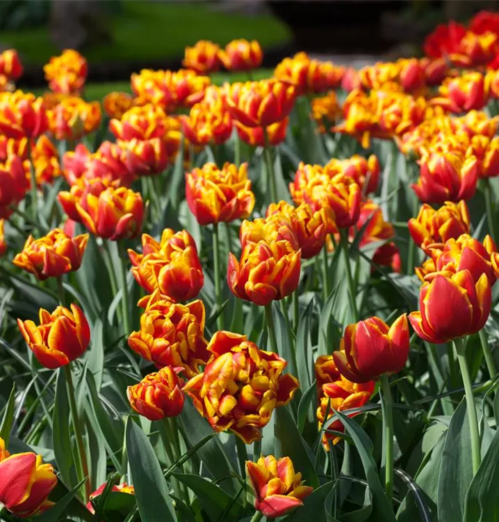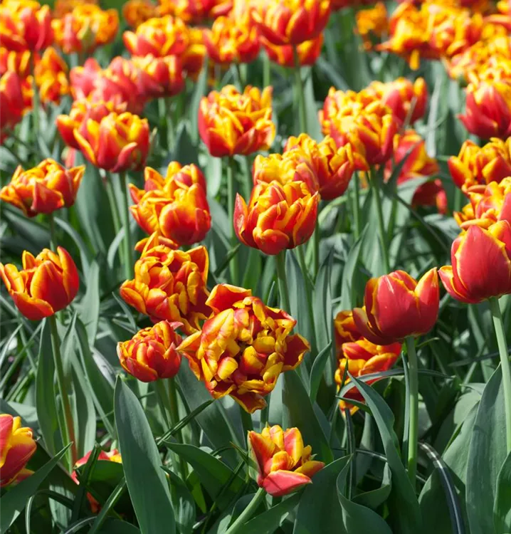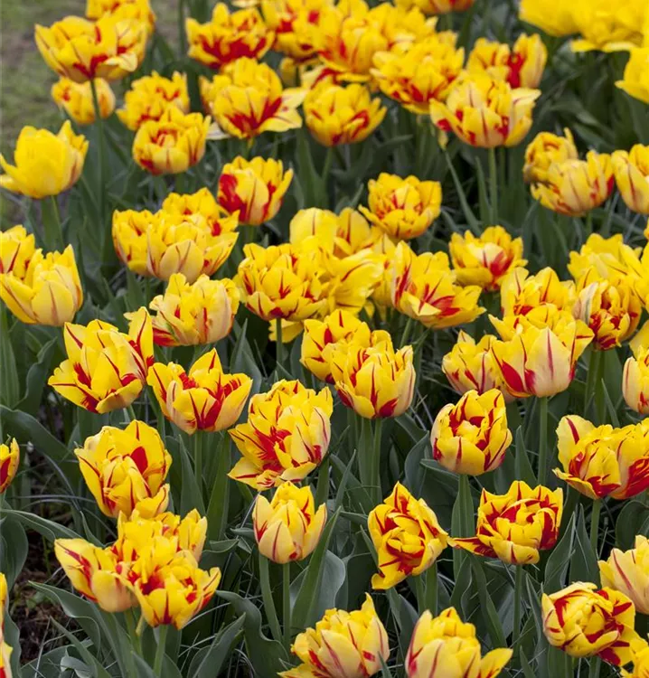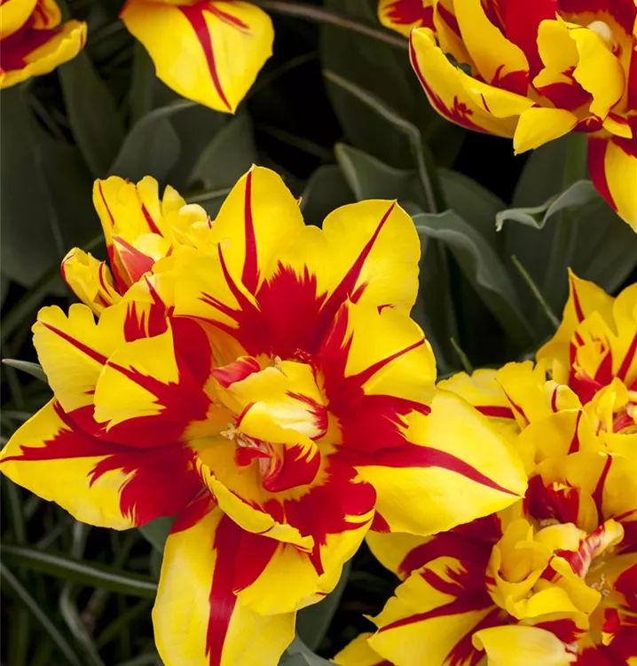 • Die Blütenpracht gefüllten Tulipa 'Monsella'entfacht ein wahres Feuerwerk an gelb-rot geflammten Blüten.