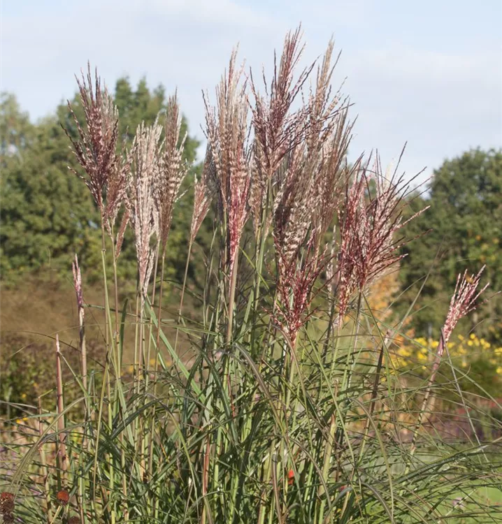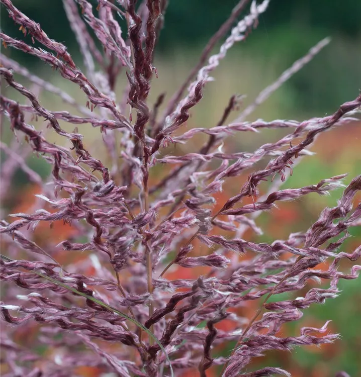 Die rot-braunen, gewellten Blüten des Garten-Chinaschilf 'Dread Locks' erscheinen in Rispen von August bis Oktober.