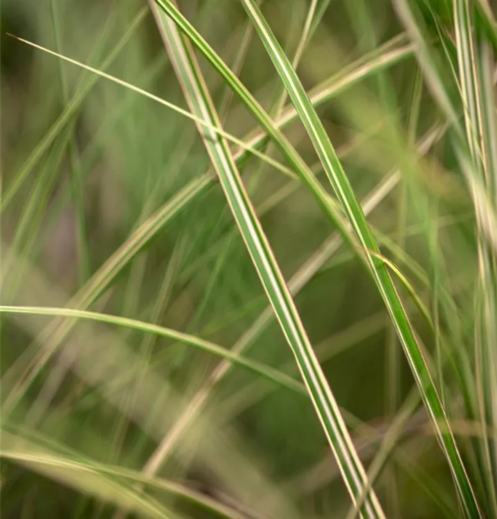 Hoher Blattschmuckwert. Die sommergrünen Blätter des Garten-Chinaschilfs 'Morning Light' sind grün-weiß, lineal.