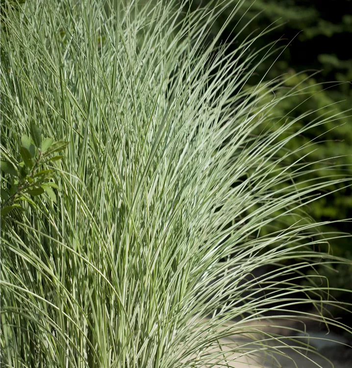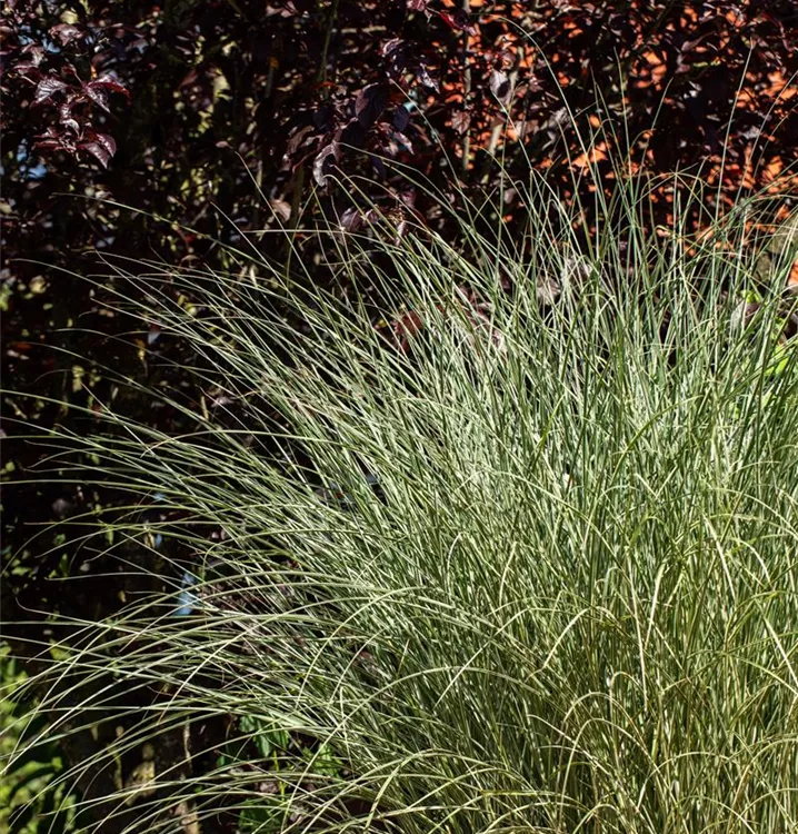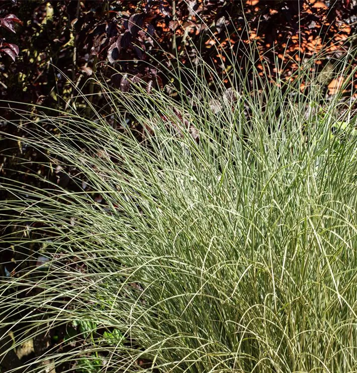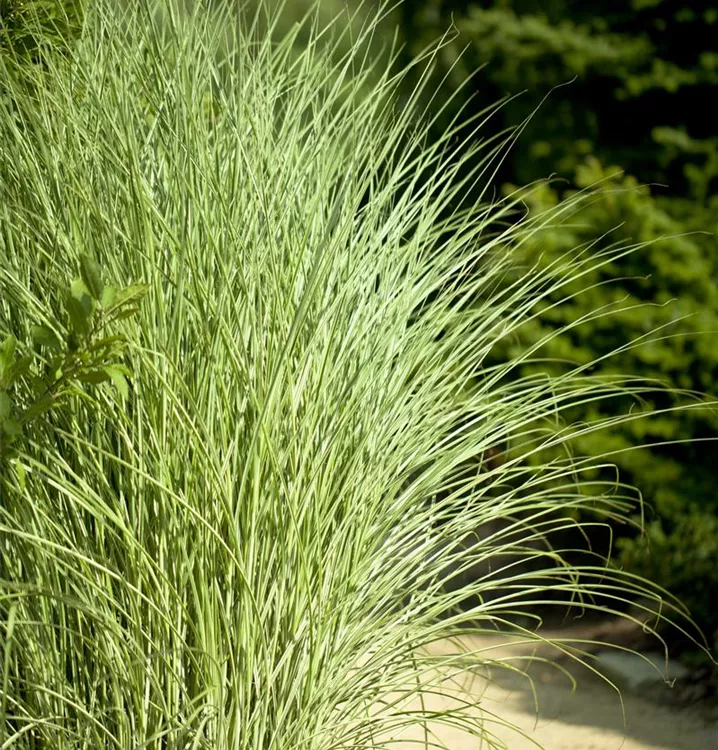 Das Garten-Chinaschilf 'Morning Light' (Miscanthus sinensis) ist mit seiner grün-weißen Blattfärbung ein dekoratives Gestaltungselement im Garten, welches sich an einem sonnigen bis halbschattigen Standort mit einem möglichst durchlässigen, humosen, nährstoffreichen Boden am wohlsten fühlt. Die silbrigen Blütenwedel schmücken die aufrecht und horstbildend wachsende Pflanze ab Herbst. Bei günstigen Bedingungen erreicht dieses winterharte Gras eine Höhe von ca. 1,2 m und wird bis zu 80 cm breit.