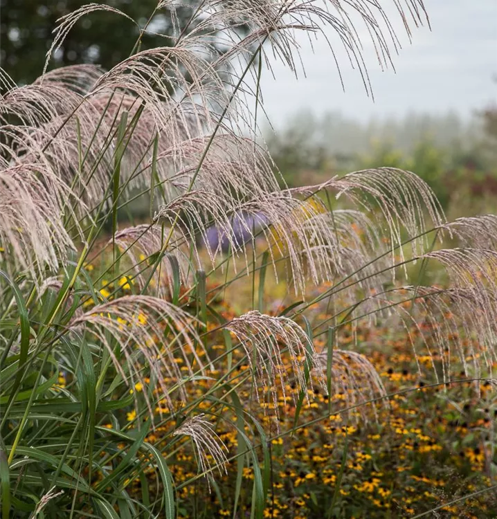 Die cremeweiß-rosafarbenen Blüten des Garten-Chinaschilf 'Rosi' erscheinen in Rispen von August bis Oktober.