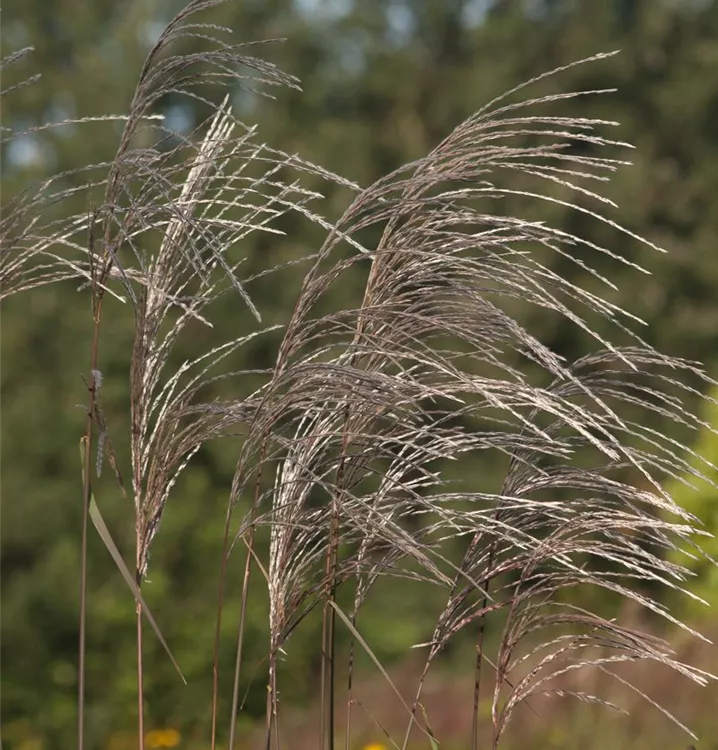 Das Garten-Chinaschilf 'Rosi' (Miscanthus sinensis) ist mit seiner mittelgrünen Blattfärbung ein dekoratives Gestaltungselement im Garten, welches sich an einem sonnigen bis halbschattigen Standort mit einem möglichst durchlässigen, humosen, nährstoffreichen Boden am wohlsten fühlt. Die cremeweiß-rosafarbenen Blütenwedel schmücken die aufrecht wachsende Pflanze ab Sommer. Bei günstigen Bedingungen erreicht dieses winterharte Gras eine Höhe von ca. 1,8 m und wird bis zu 1,5 m breit.