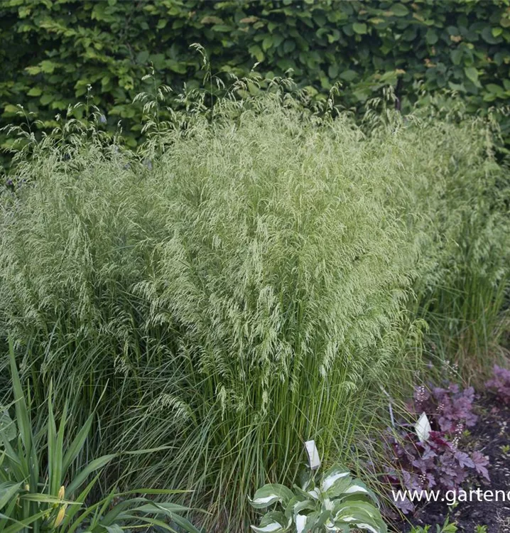 Die Garten-Schmiele 'Goldschleier' (Deschampsia cespitosa) ist mit ihrer mittelgrünen Blattfärbung ein dekoratives Gestaltungselement im Garten, welches sich an einem halbschattigen bis schattigen Standort mit einem möglichst durchlässigen, humosen Boden am wohlsten fühlt. Die gelben Blütenwedel schmücken die aufrecht und horstbildend wachsende Pflanze ab Sommer. Bei günstigen Bedingungen erreicht dieses winterharte Gras eine Höhe von ca. 40 cm und wird bis zu 40 cm breit.
