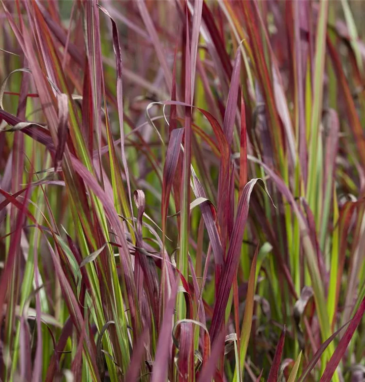 Die sommergrünen Blätter des Garten-Blutgrases 'Red Baron' sind grün-rot, lineal. Garten-Blutgras 'Red Baron' zeigt sich leuchtend rot im Herbst.