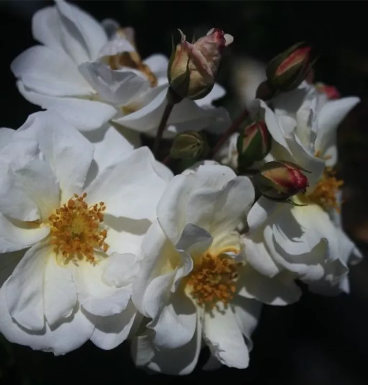 Die weißen, halbgefüllten, schalenförmigen Blüten der Beetrose 'Diamant'® erscheinen in Dolden von Juni bis September. Diese werden etwa 5 - 6 cm groß.