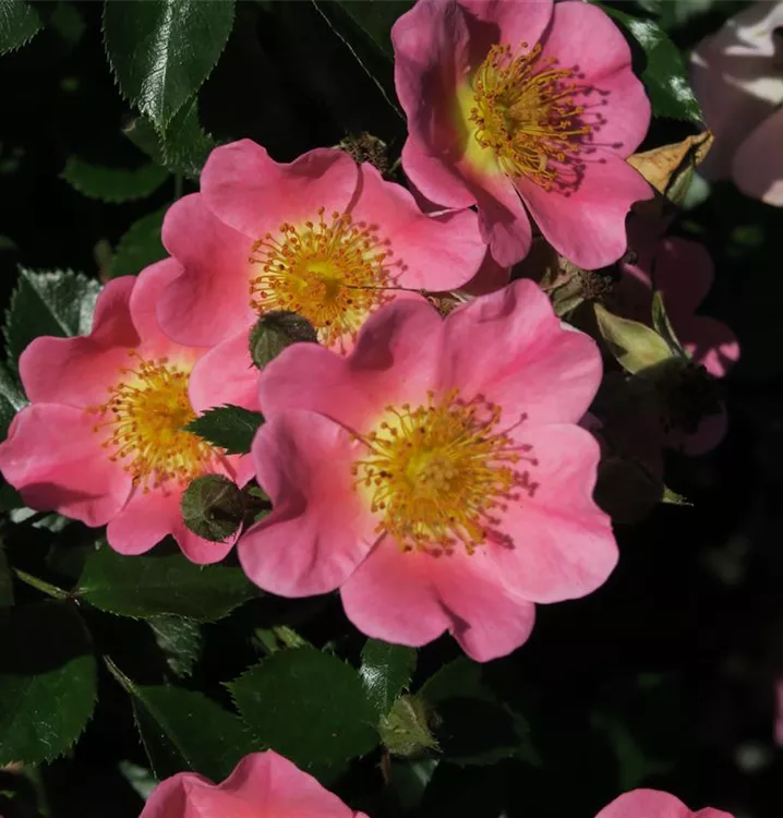 Die sommergrünen Blätter der Bodendeckerrose 'Topolina'® sind dunkelgrün, gefiedert, wechselständig.