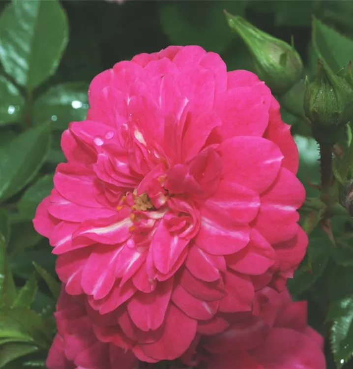 Die dunkelrosafarbenen, schalenförmigen Blüten sind starkgefüllt und erscheinen von Juni bis Oktober. Diese werden etwa 2 - 3 cm groß.