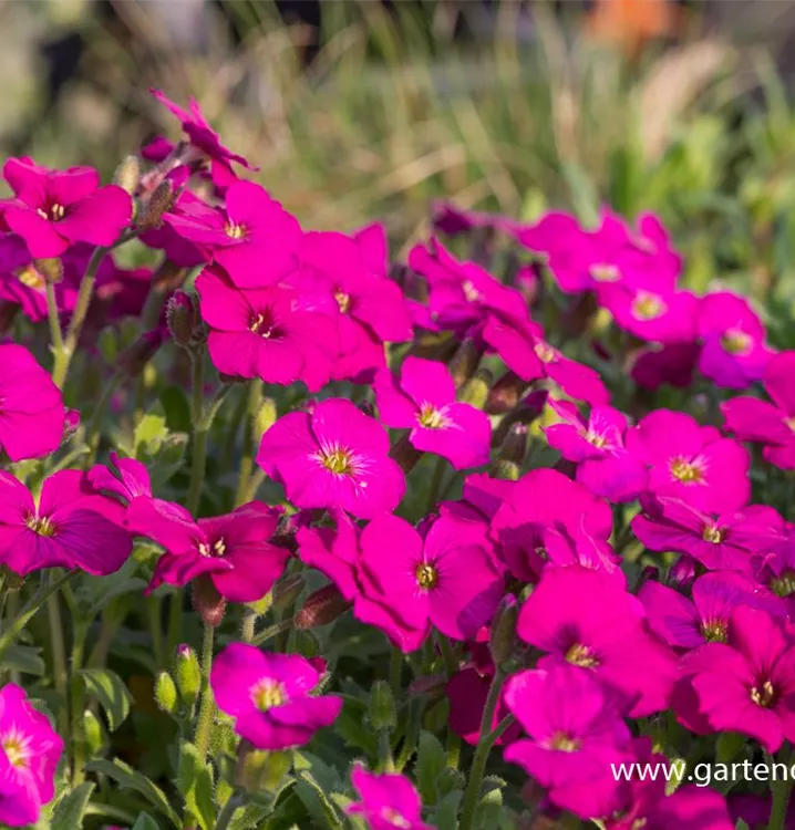 Aubrieta x cultorum 'Regado Red' bildet radförmige, purpurrote Blüten ab April.