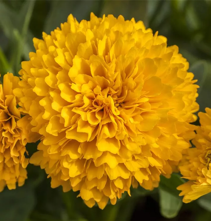 Die ansehnlichen Blüten sind goldgelb, gefüllt und erscheinen von Juni bis August.Die Blüten sind körbchenartig.