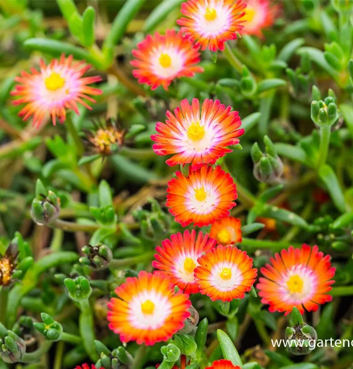 Die Coopers Mittagsblume (Delosperma cooperi, weiß) bildet weiße, ansehnliche Blüten von Juni bis Oktober. Die Blüten sind körbchenartig.