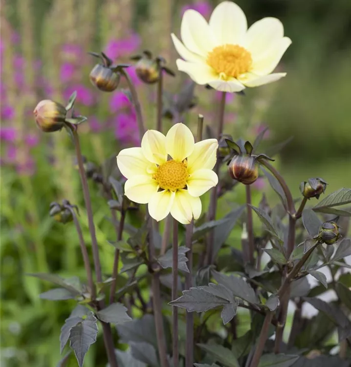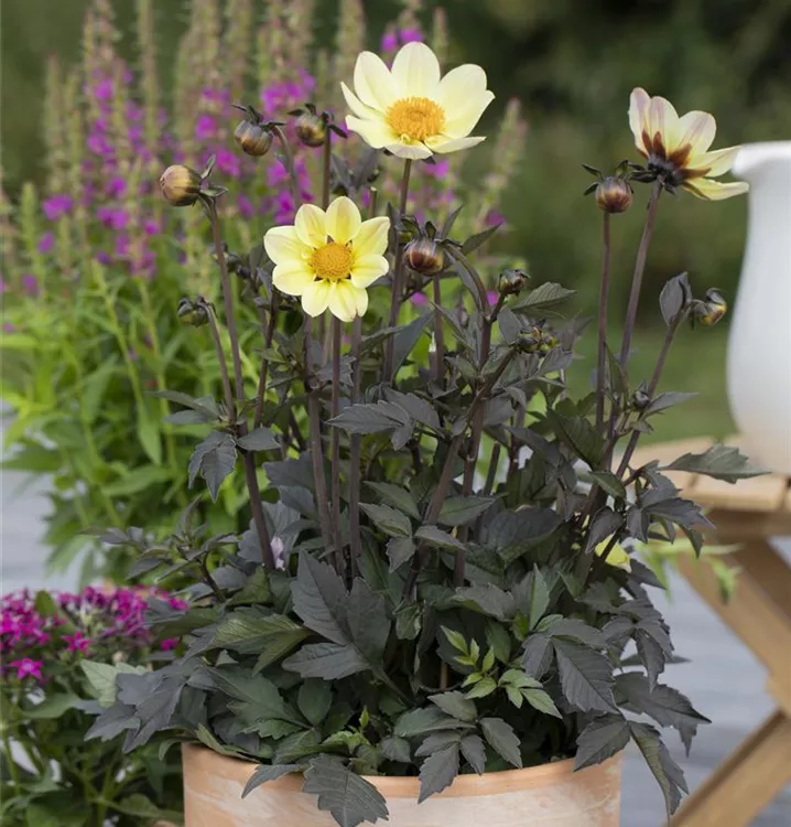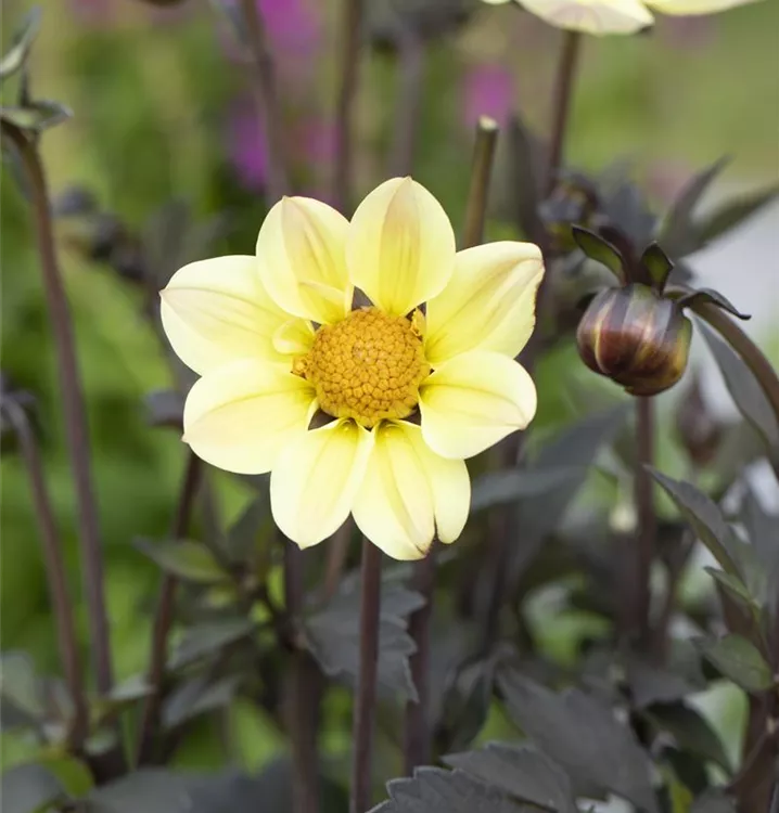 Die Einfach blühende Dahlie 'Happy Days Lemon' setzt schöne Akzente gemeinsam mit: