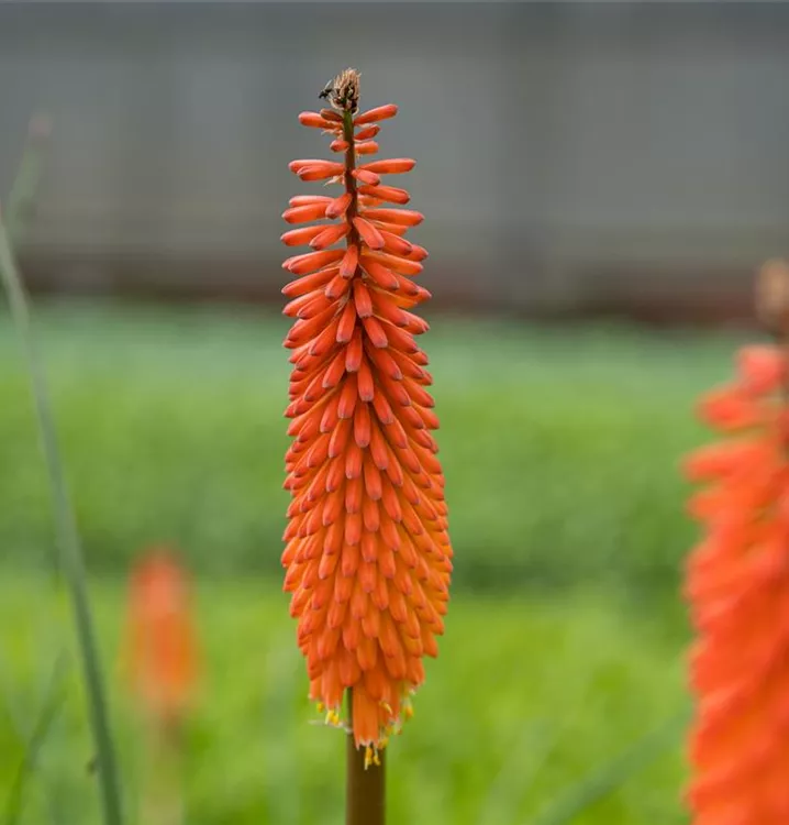 Kniphofia uvaria 'Alcazar' bildet in Kolben angeordnete, orange-rote Blüten ab Juli.