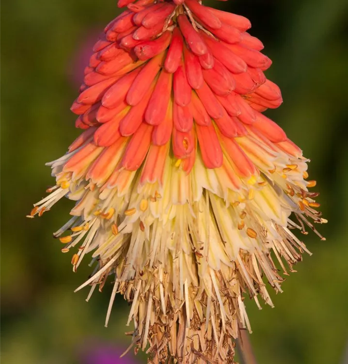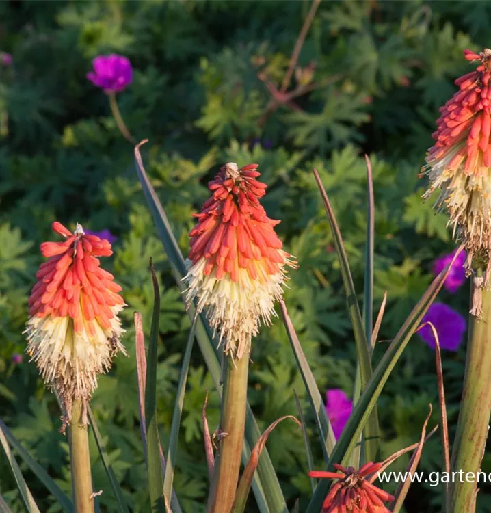 Kniphofia uvaria 'Royal Standard' bildet in Kolben angeordnete, rot-gelbe Blüten ab Juli.