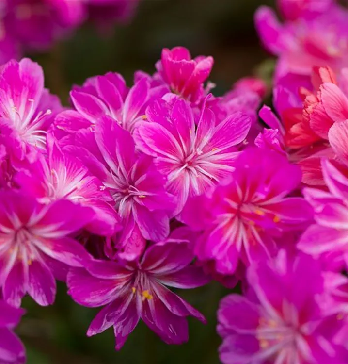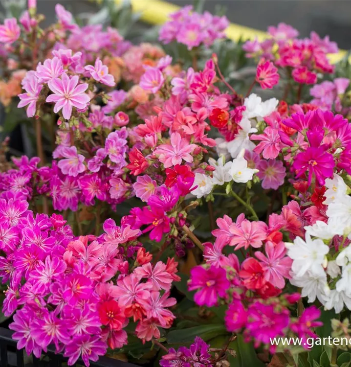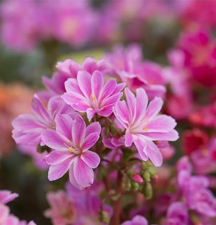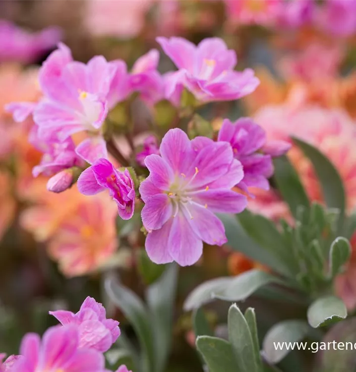 Lewisia cotyledon 'Regenbogen' bildet schalenförmige, rosafarbene Blüten ab Mai.
