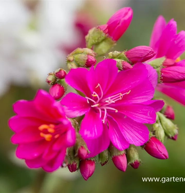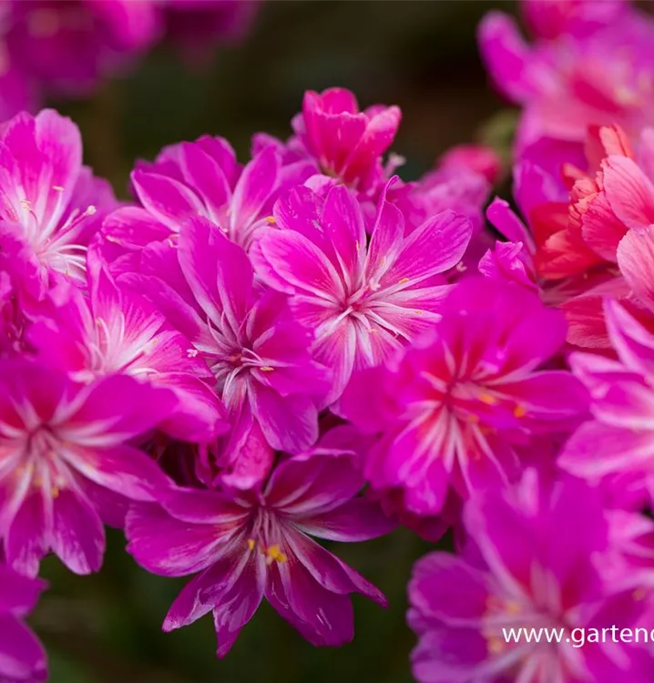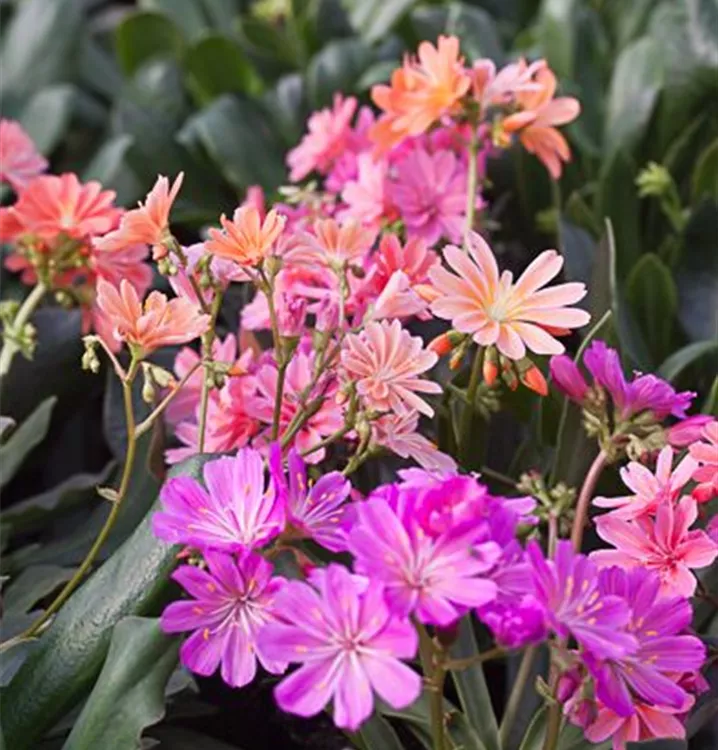 Der Garten-Bitterwurz 'Regenbogen' (Lewisia cotyledon) ist eine aufrechte wintergrüne Staude, die von Mai bis Juni rosafarbene, schalenförmige Blüten bildet. An einem sonnigen bis halbschattigen Standort mit durchlässigem, kalkfreiem Boden erreicht er gewöhnlich eine Höhe von ca. 30 cm und wird ca. 30 cm breit. Der Garten-Bitterwurz 'Regenbogen' ist gut frostverträglich.