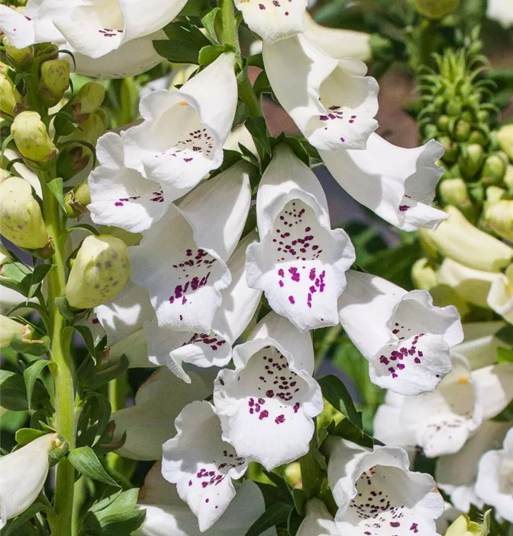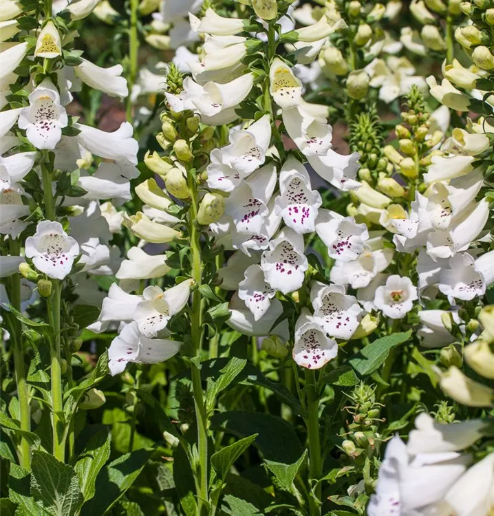 Der Garten-Fingerhut 'Alba' (Digitalis purpurea) ist eine aufrechte wintergrüne Staude, die von Juni bis Juli weiße, trichterförmige Blüten bildet. An einem sonnigen bis halbschattigen Standort mit durchlässigem, kalkfreiem Boden erreicht er gewöhnlich eine Höhe von ca. 1,3 m und wird ca. 40 cm breit. Der Garten-Fingerhut 'Alba' ist gut frostverträglich.