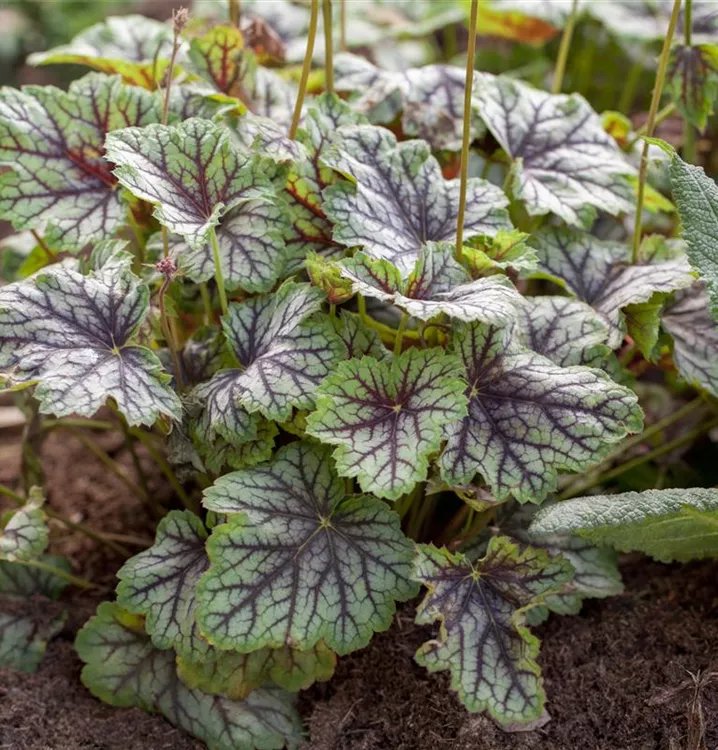 Hoher Blattschmuckwert. Die wintergrünen Blätter des Garten-Purpurglöckchens 'Green Spice' sind grün, rot geädert.