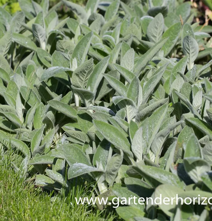 Hoher Blattschmuckwert. Die sommergrünen Blätter des Garten-Woll-Ziests 'Cotton Boll' sind grau, eiförmig, behaart.