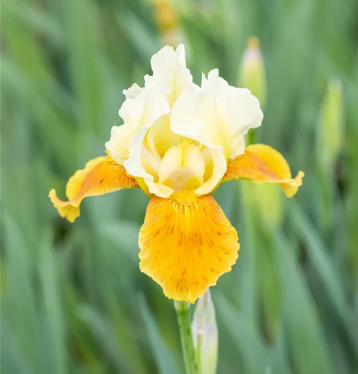 Iris x germanica 'Tulip Festival' bildet lippenförmige, blaue, violette, lilafarbene, weiße, gelbe, gelb-weiße Blüten ab Mai.