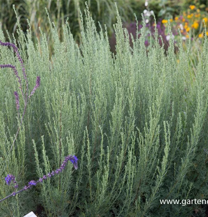 Der Kampfer-Wermut (Artemisia alba) ist eine aufrechte Staude, die von Juli bis September hellgelbe Blüten bildet. An einem sonnigen Standort mit durchlässigem Boden erreicht er gewöhnlich eine Höhe von ca. 1 m und wird ca. 80 cm breit. Der Kampfer-Wermut ist gut frostverträglich.