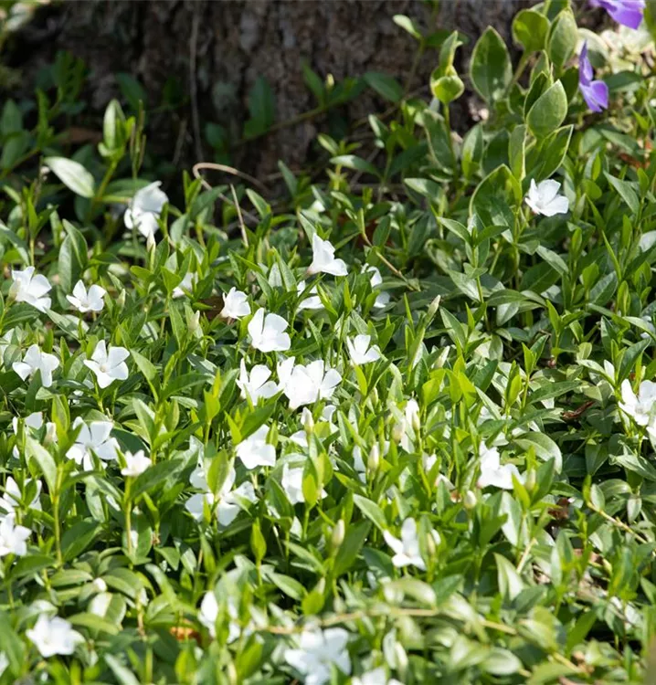 Vinca minor 'Alba' bildet radförmige, weiße Blüten ab Mai. Bei richtiger Pflege Nachblüte im September.