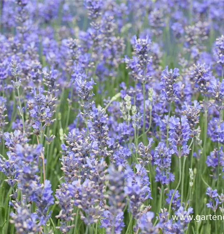 Der Bastard-Garten-Lavendel 'Bowles Variety' (Lavandula x intermedia) ist eine buschige, dichte wintergrüne Staude, die von Juli bis August blauviolette Blüten mit einem angenehmen Duft bildet. An einem sonnigen Standort mit durchlässigem Boden erreicht er gewöhnlich eine Höhe von ca. 40 cm und wird ca. 30 cm breit. Der Bastard-Garten-Lavendel 'Bowles Variety' ist gut frostverträglich.