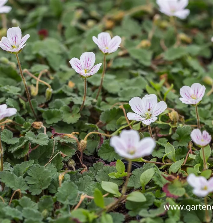 Erodium x variabile 'Album' bildet weiße Blüten ab Mai.