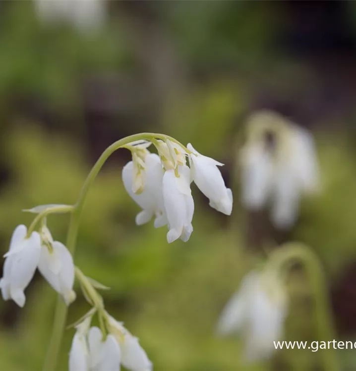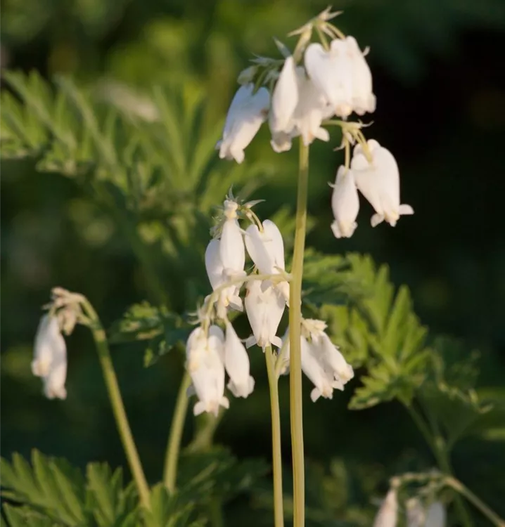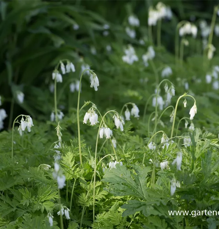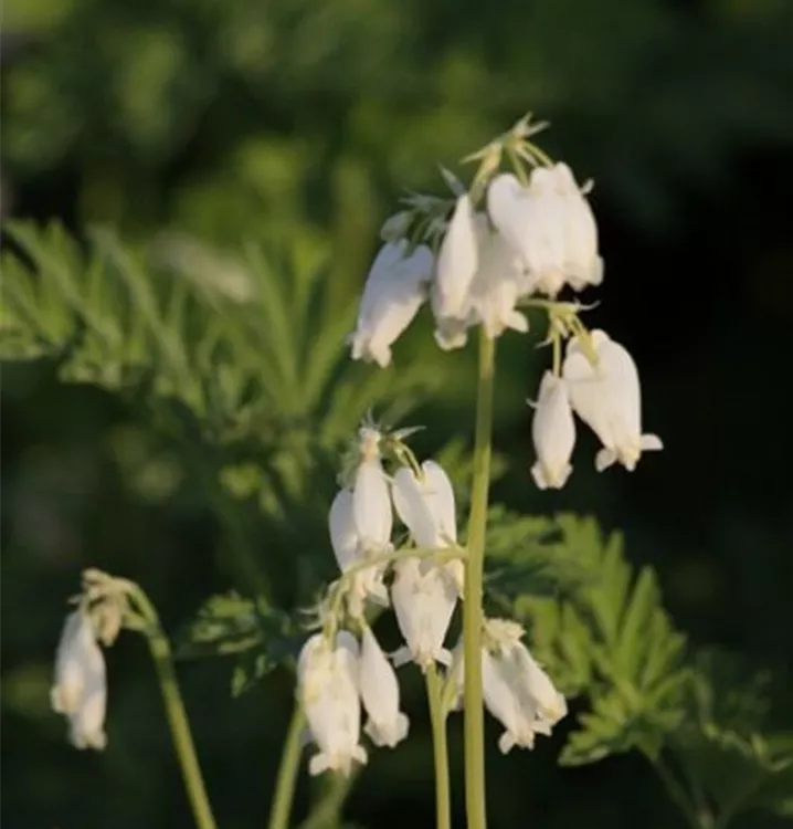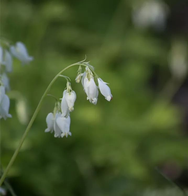 Dicentra eximia 'Alba' bildet in Trauben angeordnete, weiße Blüten ab Mai.