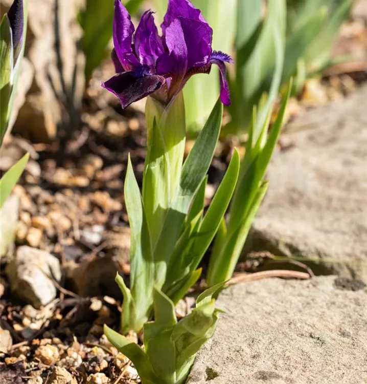 Iris barbata-nana 'Cherry Garden' bildet purpurrote Blüten ab Mai.