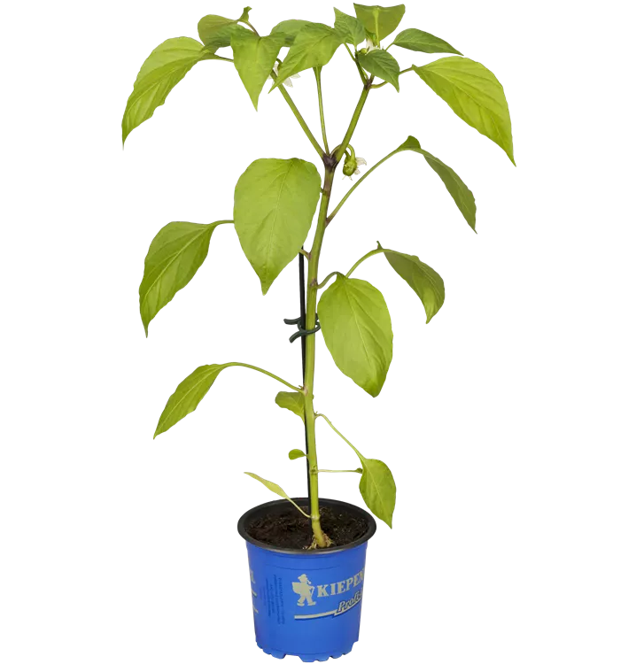 Die Blätter der Snack-Paprika 'Lubega® Mini Orange' sind mittelgrün, lanzettlich, ganzrandig.