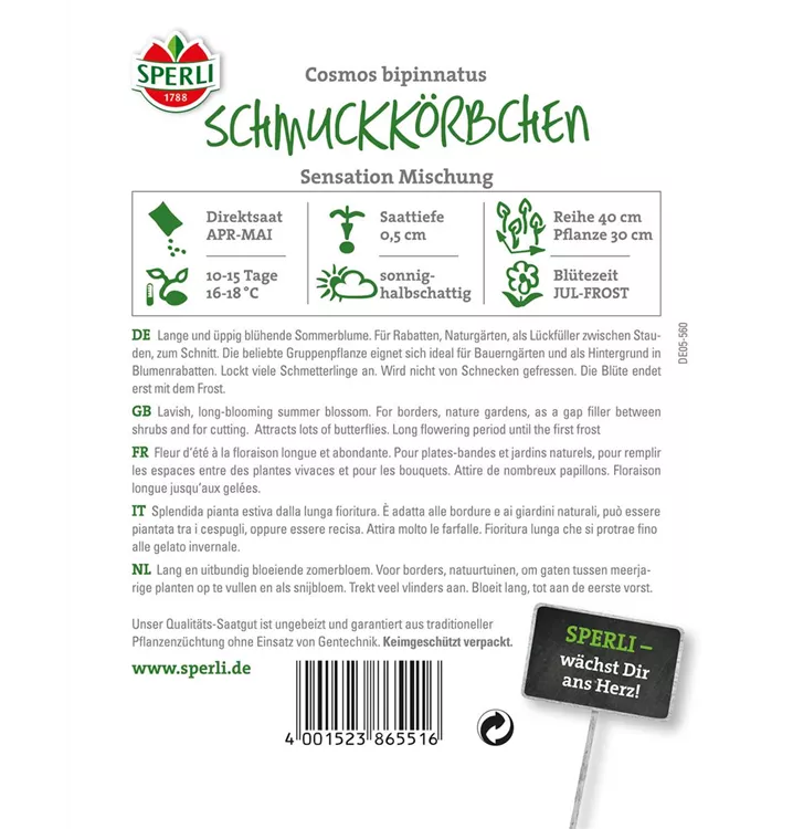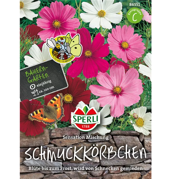 Das Fiederblättrige Schmuckkörbchen 'Sensation' (Cosmos bipinnatus) ist eine beliebte Pflanze für den Balkon. Die unzähligen Blüten erscheinen, je nach Sorte, in verschiedenen Farben die ganze Saison hindurch. Ein sonniger Standort und ein durchlässiges Substrat werden bevorzugt.
