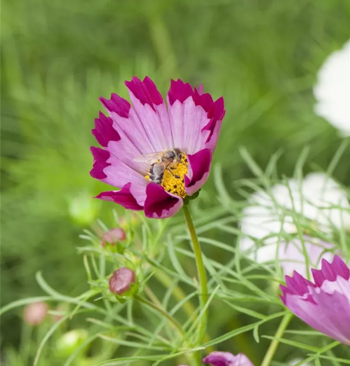 Cosmos bipinnatus 'Sea Shells' bildet während der gesamten Saison zahlreiche körbchenartige, weiße, rosafarbene, rote, cremeweiße Blüten.