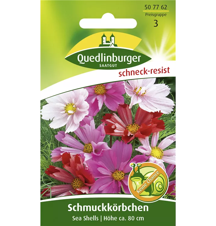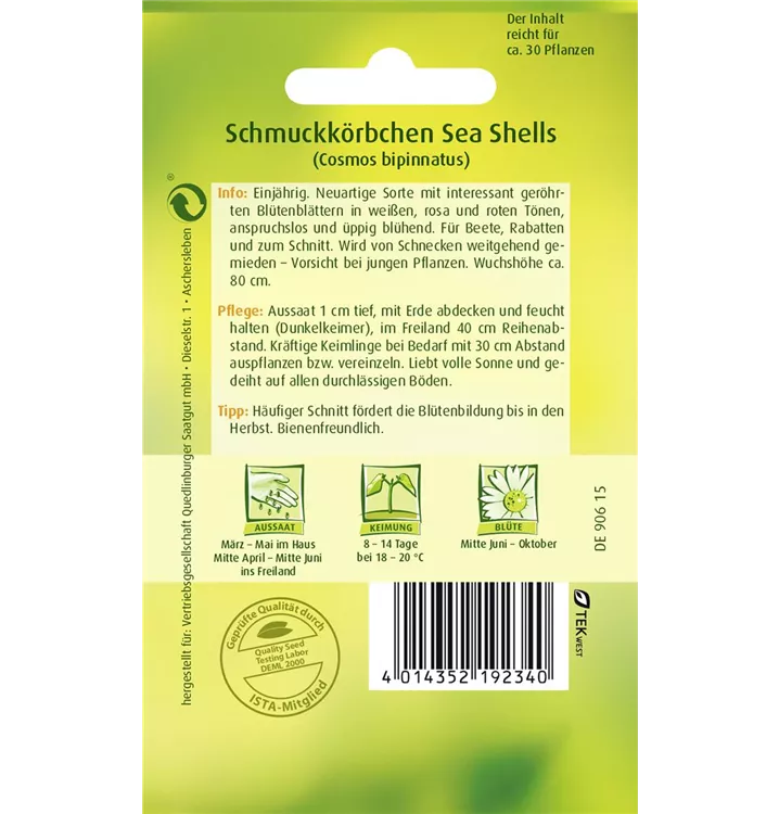 Die Fiederblättrige Schmuckkörbchen 'Sea Shells' (Cosmos bipinnatus) ist eine beliebte Pflanze für den Balkon, die während der gesamten Saison unzählige weiße, rosafarbene, rote, cremeweiße Blüten bildet. Die hellgrünen Blätter sind gefiedert. Ein sonniger Standort und ein durchlässiges Substrat werden bevorzugt.