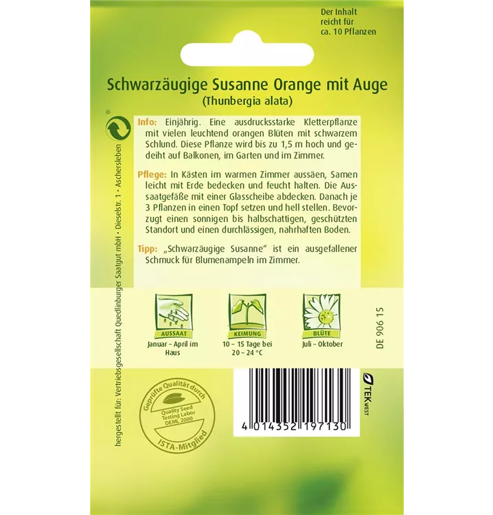 Die Schwarzäugige Susanne, orange (Thunbergia alata) ist eine beliebte Pflanze für den Balkon, die während der gesamten Saison unzählige orangefarbene Blüten bildet. Die mittelgrünen Blätter sind herzförmig. Ein sonniger bis halbschattiger Standort und ein durchlässiges Substrat werden bevorzugt.