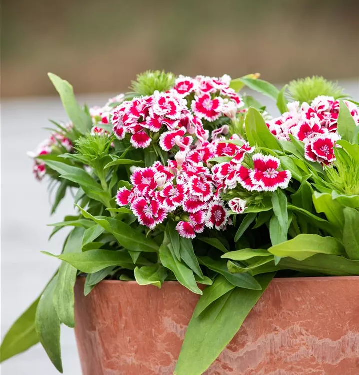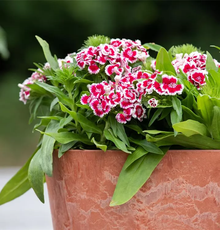 Dianthus barbatus, rot-weiß bildet radförmige, rot-weiße Blüten ab Juni. Diese verströmen einen angenehmen Duft.