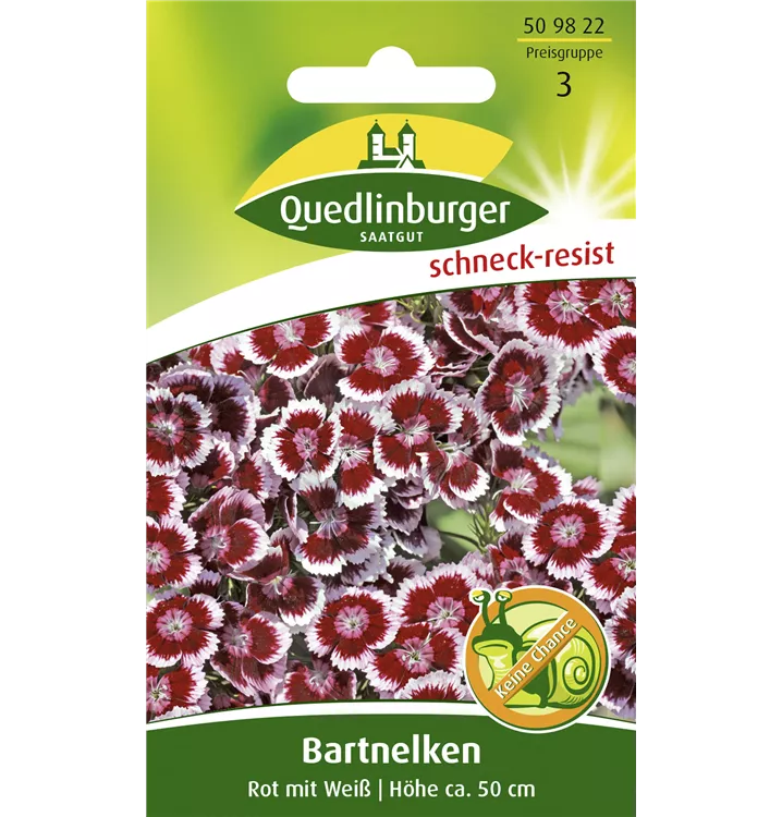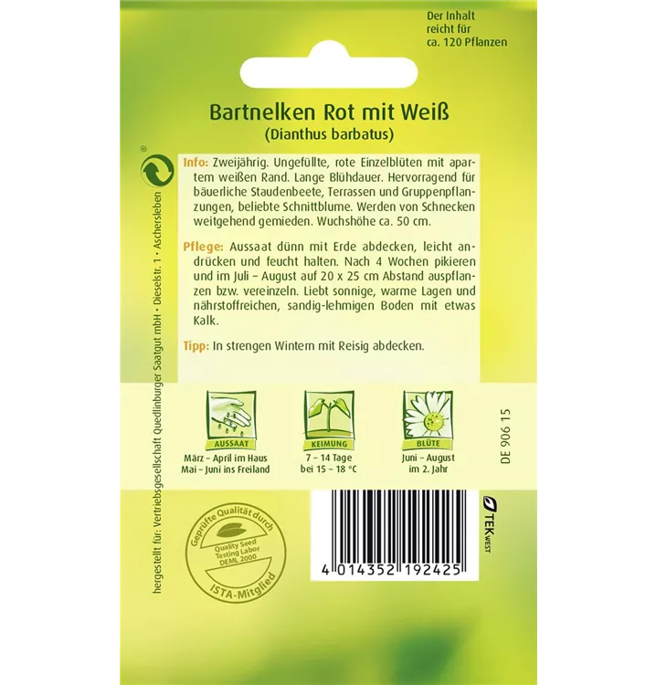 Die Bartnelke (Dianthus barbatus) ist eine buschige, aufrechte Staude, die von Juni bis August rot-weiße, radförmige Blüten mit einem angenehmen Duft bildet. An einem sonnigen Standort mit durchlässigem, nährstoffreichem Boden erreicht sie gewöhnlich eine Höhe von ca. 50 cm und wird ca. 40 cm breit. Die Bartnelke ist gut frostverträglich.