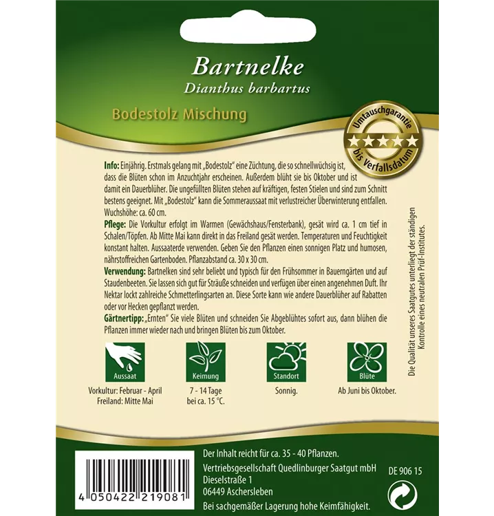 Die Bartnelke 'Bodestolz' (Dianthus barbatus) ist eine buschige Staude, die von Juni bis Oktober mehrfarbige, radförmige Blüten mit einem angenehmen Duft bildet. An einem sonnigen Standort mit durchlässigem, nährstoffreichem Boden erreicht sie gewöhnlich eine Höhe von ca. 60 cm und wird ca. 30 cm breit. Die Bartnelke 'Bodestolz' ist gut frostverträglich.
