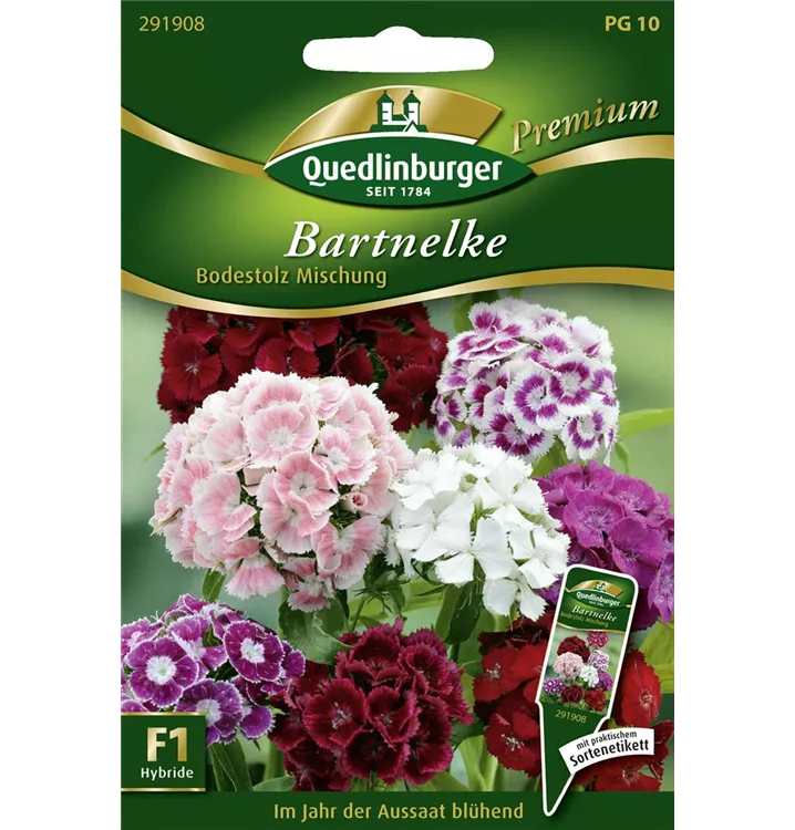 Dianthus barbatus 'Bodestolz' bildet radförmige, mehrfarbige Blüten ab Juni. Diese verströmen einen angenehmen Duft.