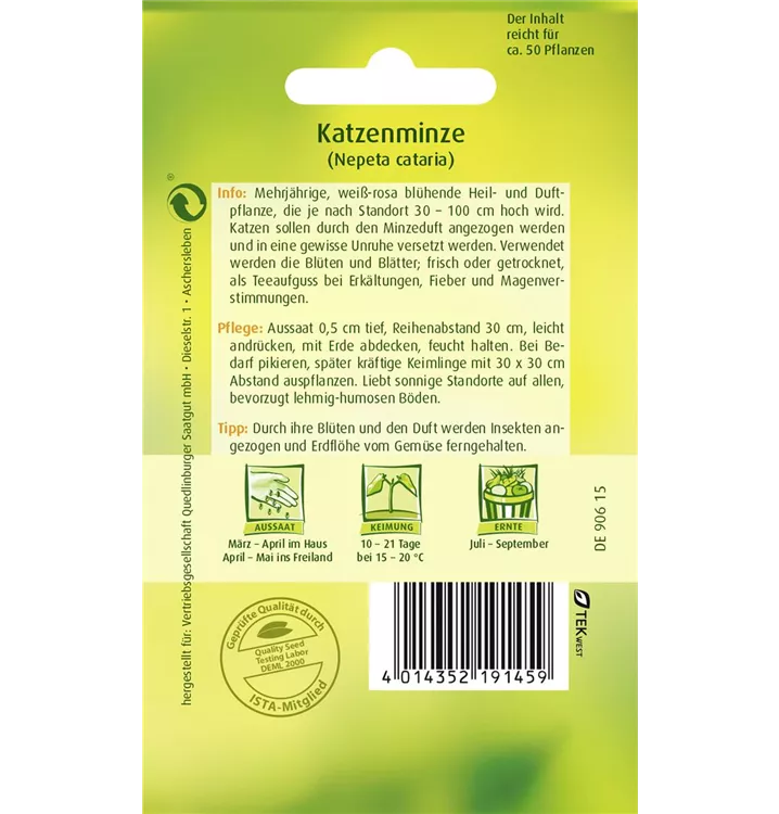 Die Gewöhnliche Katzenminze (Nepeta cataria) ist eine horstbildende, buschige, aufrechte Staude, die von Juli bis September weiße, lippenförmige, in Ähren angeordnete Blüten bildet. An einem sonnigen Standort mit durchlässigem, sandigem, lehmigem Boden erreicht sie gewöhnlich eine Höhe von ca. 1 m und wird ca. 50 cm breit. Die Gewöhnliche Katzenminze ist gut frostverträglich.