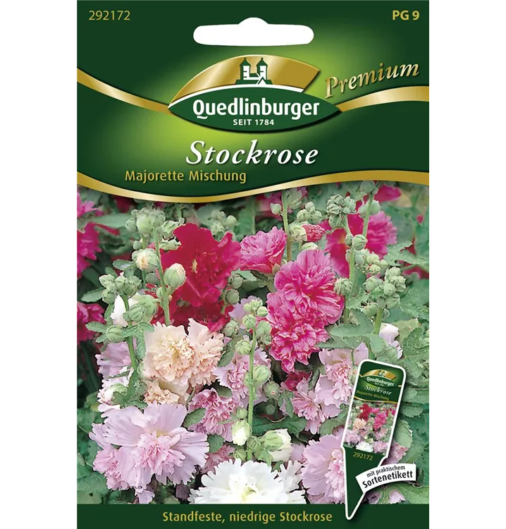 Die Stockrose 'Majorette' (Alcea rosea) ist eine aufrechte, horstbildende Staude, die, je nach Sorte, schalenförmige Blüten in verschiedenen Farben bildet. An einem sonnigen Standort mit durchlässigem Boden erreicht sie gewöhnlich eine Höhe von ca. 1 m und wird ca. 40 cm breit. Die Stockrose 'Majorette' ist gut frostverträglich.