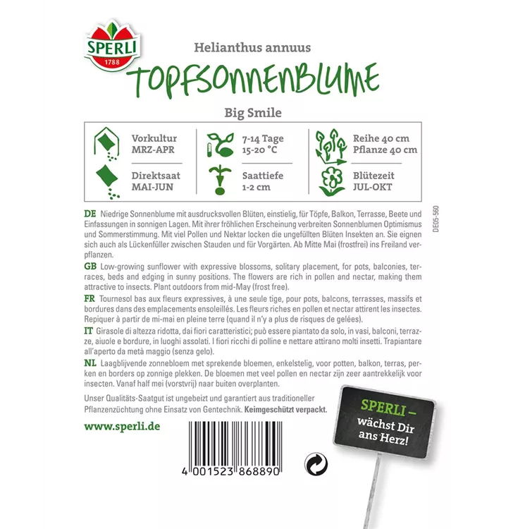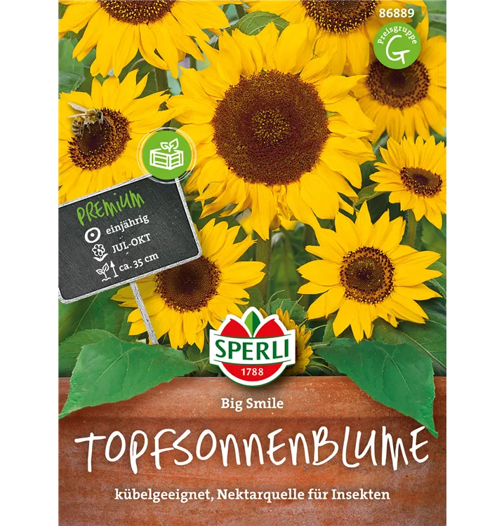 Die Sonnenblume 'Big Smile' (Helianthus annuus) ist eine beliebte Pflanze für den Balkon, die während der gesamten Saison unzählige gelbe Blüten bildet. Ein sonniger Standort und ein durchlässiges Substrat werden bevorzugt.